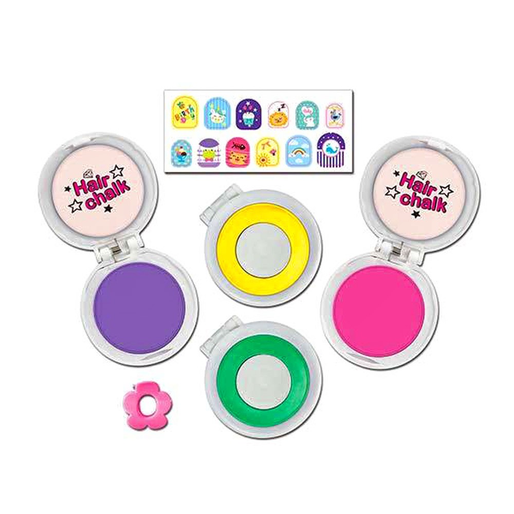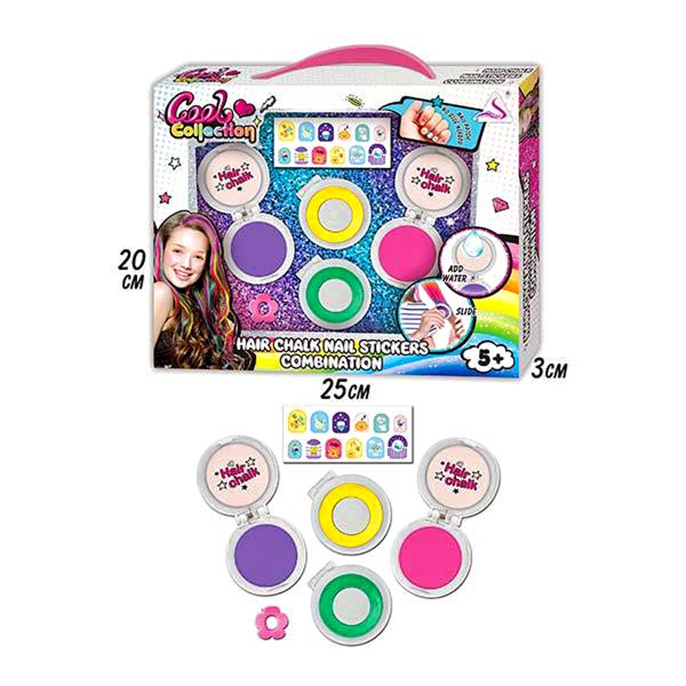 Комплектът съдържа 4 цвята креда за оцветяване на кичури, шноличка и самозалепващи се стикерчета за маникюр.